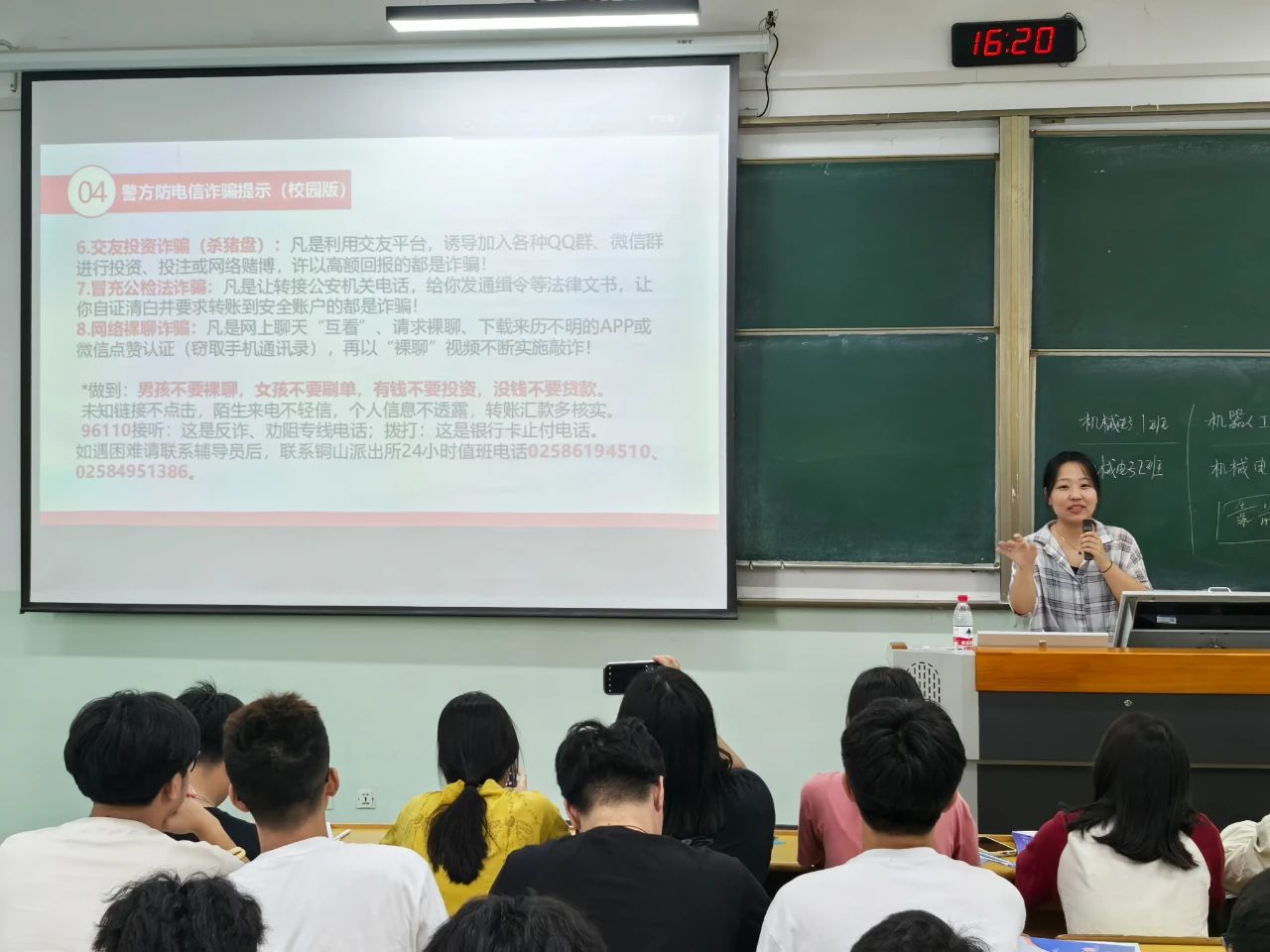 辅导员蔡黎于A1N101召开2024级电气工程及其自动化专业5-8班新生第一课班会。蔡老师围绕“新学期、新起点、新期待”的主题,分享了“大学之道”,从坚持自律、发展特长、专注提升等多个方面为新同学们提出建议,并开展了防诈骗专题宣讲,帮助学生树立规矩意识和安全底线,结合典型案例,提醒学生时刻保持警惕,增强判断能力。此外,蔡老师对新生军训、分级考试等具体工作也进行了安排说明。