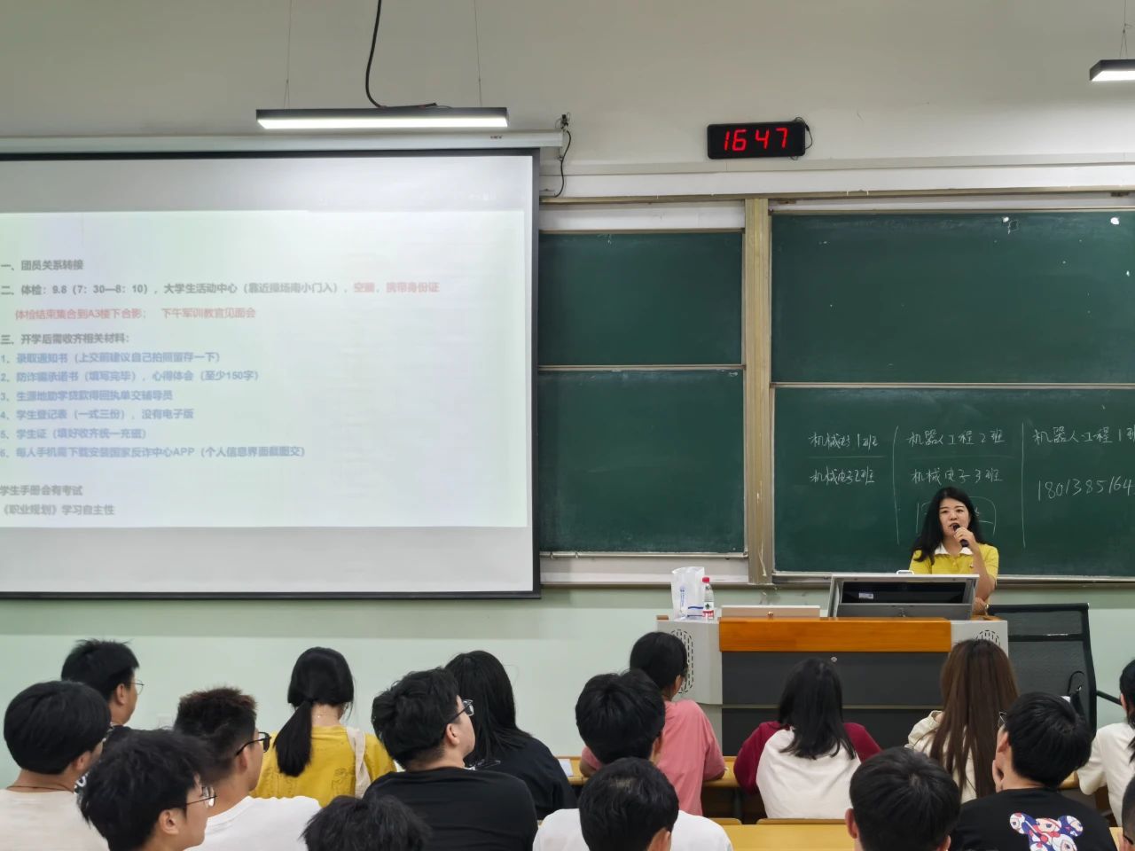 辅导员任雪于A4N205面向机械电子工程和机器人工程专业所有学生召开新生入学第一课。会上,任老师对新同学们的到来表示欢迎,并从学院介绍、医保资助、评奖评优、开学近期安排以及注意事项等方面开展入学教育。着重提醒新生们注意安全问题,特别是个人安全和网络安全,提醒大家提高安全防范意识,保护好个人信息。最后,鼓励新生们积极面对大学生活中的挑战,学习生活中遇到问题及时反馈,帮助他们更好地适应大学生活,如遇到特殊情况第一时间联系辅导员。另外,参加本次会议的还有机器人工程专业的丁雪萍老师,丁老师继辅导员之后又给本专业的学生做了未来职业择业和就业方面的指导,耐心解答新生的困惑。