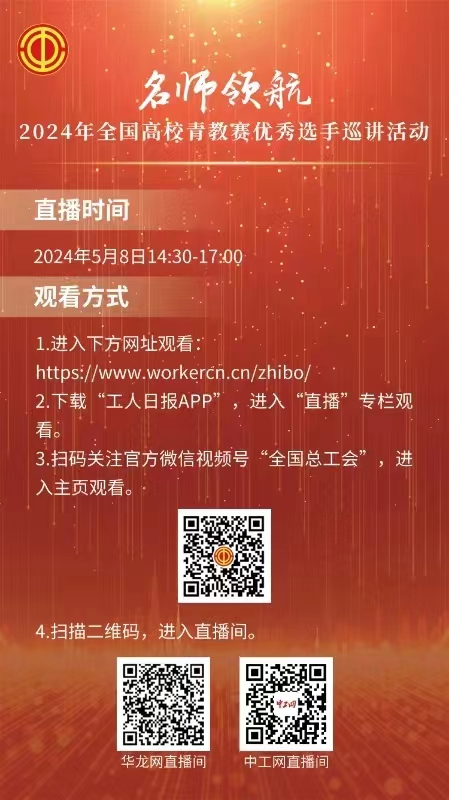 各位老师,上午好,由中国教科文卫体工会主办的名师领航2024年全国高校青教赛优秀选手巡讲活动近日在重庆举行,活动将于5月8日(星期三)下午14:30—17:00进行线上直播,请组织教师观看。