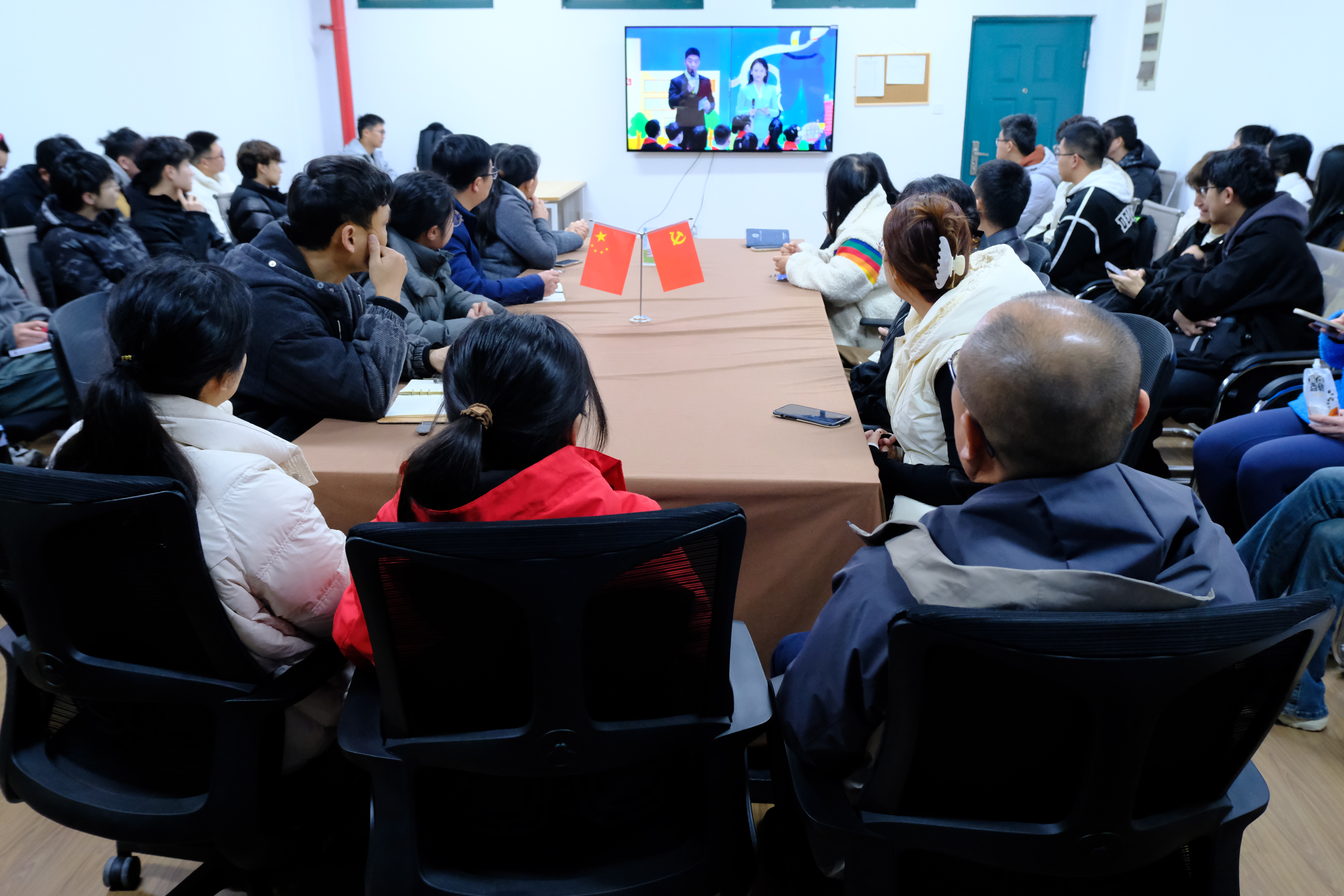 实验室指导老师和学生在学院大厅观看