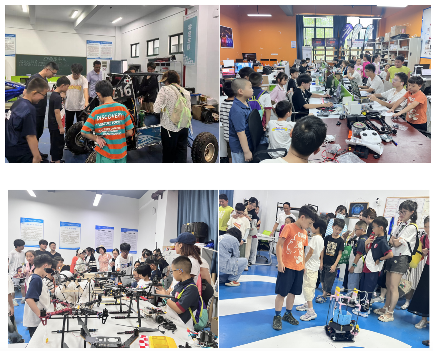 随后,在张建兵老师的引领下,青少年们参观了大学生科技展厅及科创实验室,实地接触并体验了节能车、越野车、无人驾驶平衡车、无人机、机甲机器人等实物和模型。在零度车队,他们深入了解了赛车设计与制造的科学原理,感受了速度与激情的碰撞;在航模队,他们探索了航空模型的飞行原理,领略了飞行的自由与梦想;在机器人战队,他们参观了机器人设计与编程,了解了人工智能在现代科技中的应用;在智能算法实验室,他们体验了智能算法在解决实际问题中的重要作用,激发了创新思维。