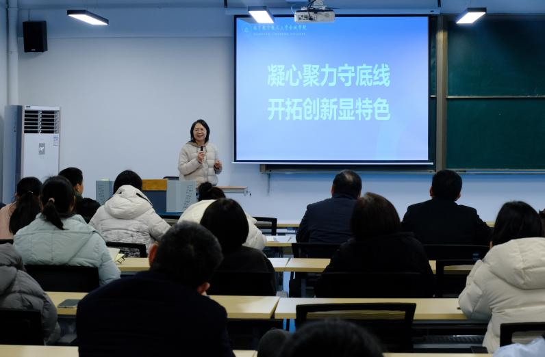 随后,刘文波院长围绕“凝心聚力守底线,开拓创新显特色”的主题进行了发言。她着重强调了筑牢师德师风红线、教育教学基线和安全稳定防线三条底线的重要性,提出打造教学创新重构建、产教融合新突破和育人品牌再塑造三个亮点。同时指出,构建双重保障、激发内生动力是推动学院发展的关键所在,为学院的发展注入了强劲动力。