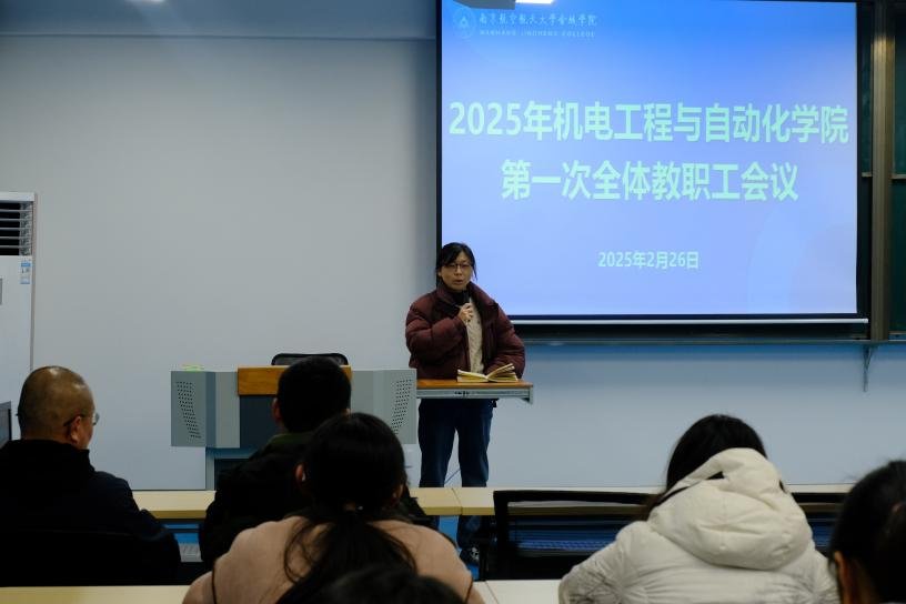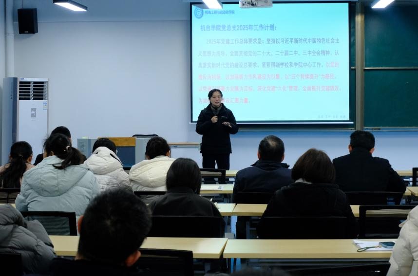 最后,党总支书记田晋谈到2025 年党建工作将从以下四个关键方面深入开展:在凝心铸魂强根基上发力,持续强化政治理论武装,筑牢思想根基;在锻造能力强作风上用功,不断提升教育教学水平,以优良作风推动工作落实;在凸显廉洁强底线上着力,持续增强纪律约束力,严守纪律红线;在党建引领增动能上创新,持续推进党建与业务深度融合,实现互促共进。她着重指出,要秉持以党建引领聚力发展为核心的工作思路,全方位提升党建工作质效,为加快机自建设凝聚强大力量。